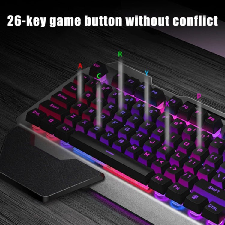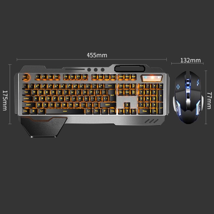 Keyboard specifications:1. Weight: 1038 g2. Dimensions: 45.5 x 17.5 x 4.5 cm3. Features: metal panel, 2.4G wireless technology, battery-free rechargeable, cool backlight effect, dedicated gaming chip, electroplating double wings, plug and play, game optical engine4. No punch quantity: 24 keys without punch5. Transmission distance: 10 m6. Interface: USB7. DPI adjustable: 800/1200/1600/24008. Battery capacity: 3000 mah9. Button life: about 10 million timesMouse specifications:1. Weight: 110 g2. Dimensions: 13.2 x 7.7 x 4.1 cm3. Buttons: 6 buttons4. Transmission distance: 10 m5. Resolution: 2400 dpi6. Working method: optical engine7. Interface: USB8. Battery capacity: 800 mah9. Connection: 2.4Ghz wireless connection